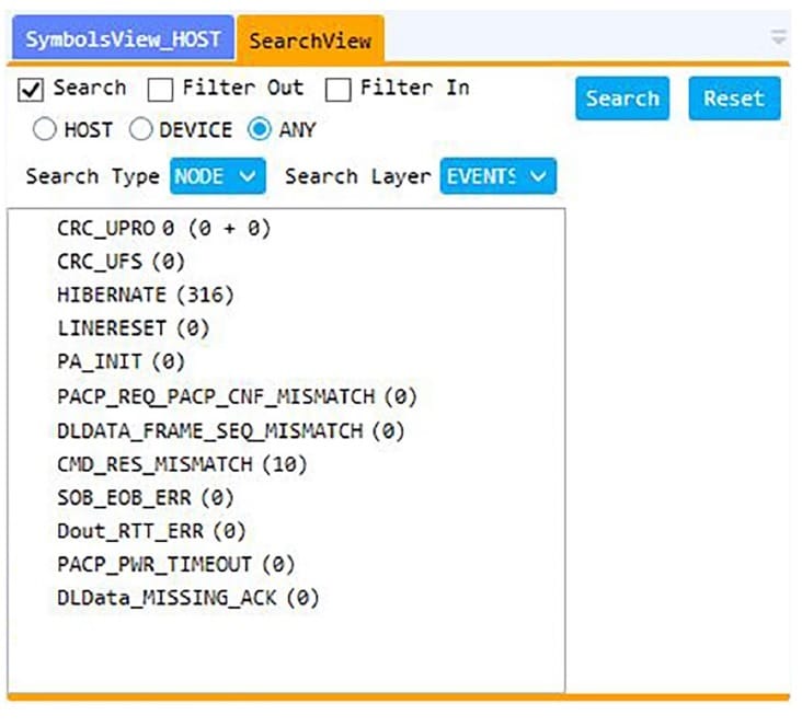 PGY-UFS3.X-PA Software does the live decode and list all the events. The list of events are shown in this picture. Users can easily note the errors in captured protocol data. In large buffer capture, it takes extremely difficult to locate the errors. But PGY-UFS3.X-PA software simplifies this by listing events while decoding the captured data. Search and Filter allows you directly locate the error events or UFS or UniPro or PACP packet in the protocol listing windows. Filter-in and Filter-out makes it easy view the data of interest