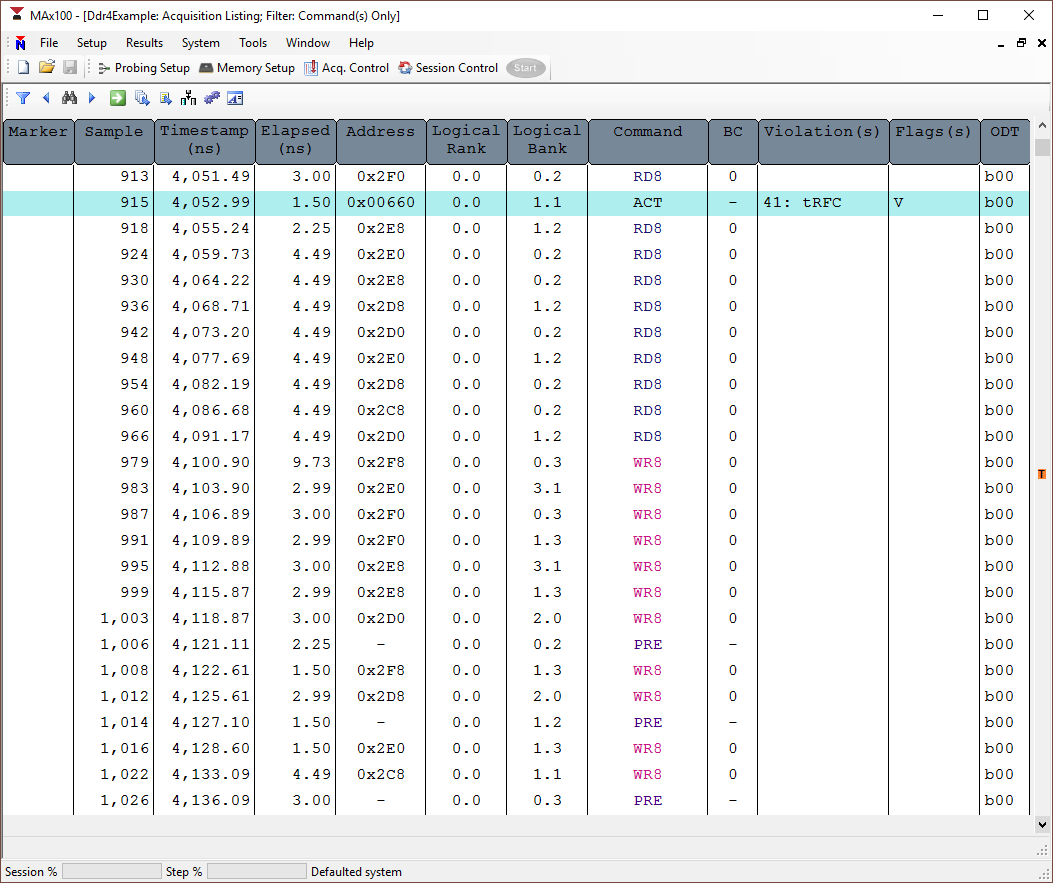 From first starting the software there are five easy steps to start gathering data. First click the New icon (1) and select the system file for the interposer/probe you are using. Next reset your target to ensure MRS data is sent. The analyzer will automatically acquire this information! Now click the Memory Setup button (2) to display the setup window. Then select the correct speed bin, rank count, and density (3). Last, click the Update Memory Configuration button (4) to apply the MRS data to the analyzer’s setup. That’s it. You are ready to start analyzing data!